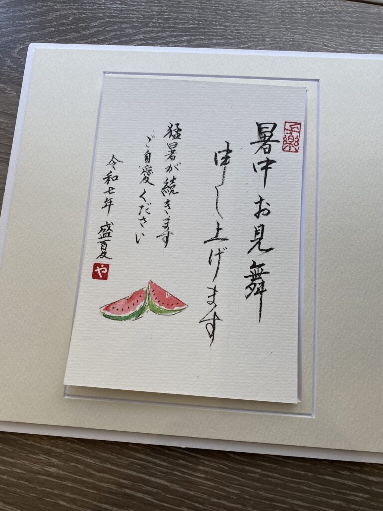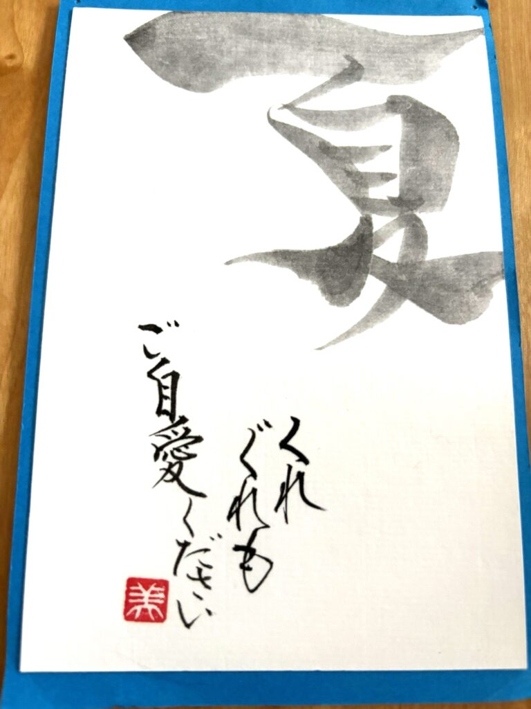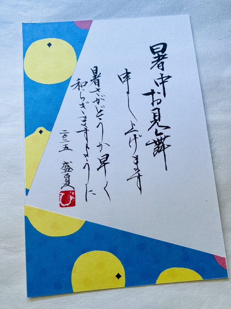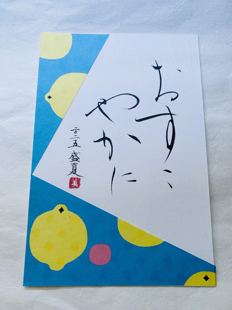 ☀️✨🧁🟡🍦🌧️🦋☘️💧 字手紙で暑中お見舞い 友人が消しゴムで蓮🪷作ってくれました 蓮のイメージで 清らか と入れてみました 福岡の大濠公園の蓮思い出します 包装紙をカットしてハガキに貼りました 工夫するといろんなデザイン楽しめます 生徒さん制作 生徒様 仕上げ作品
